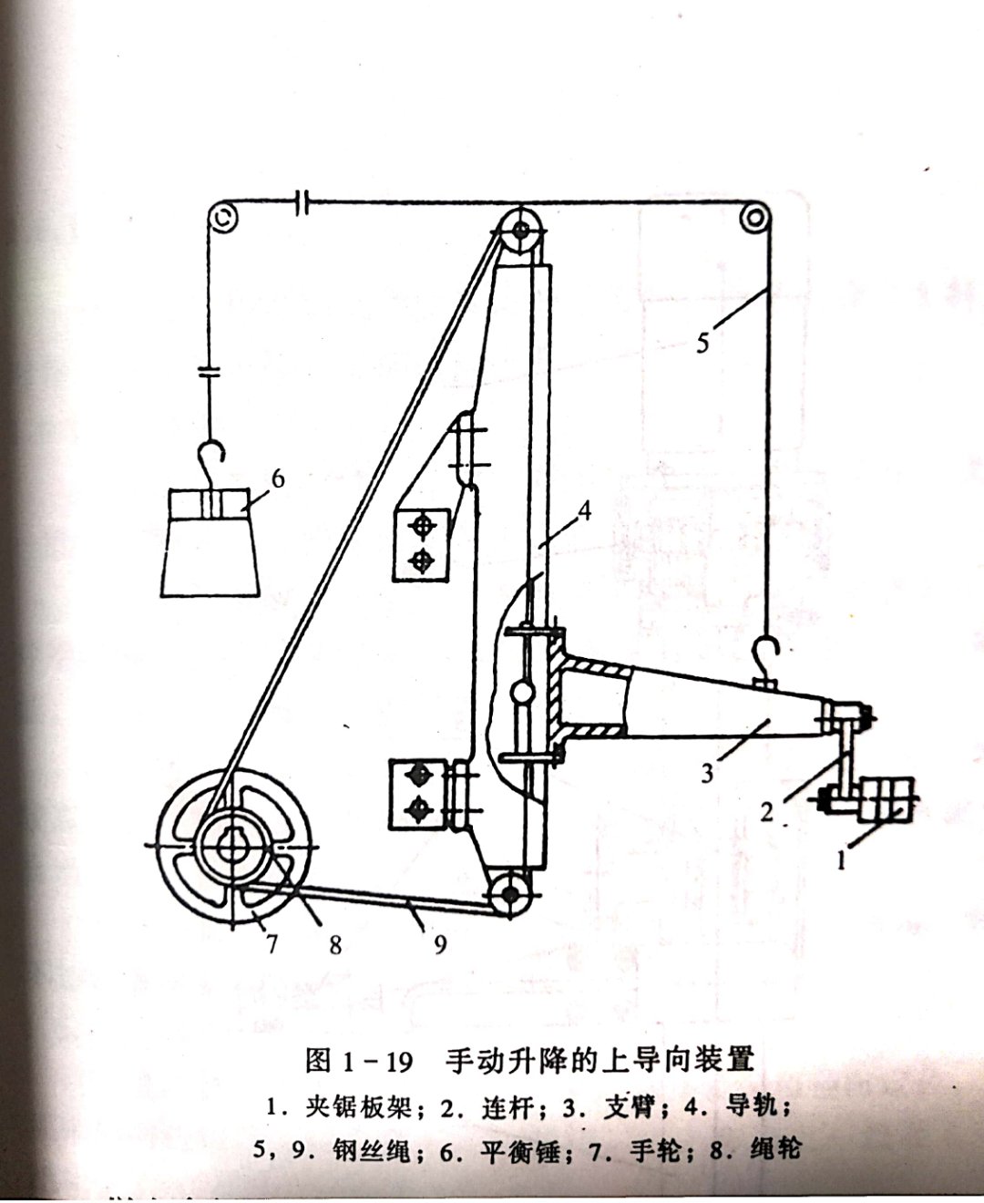 圖1-19為手動升降的帶鋸條上導(dǎo)向裝置。夾鋸板架1用連桿2同支臂3的一端相連接,支臂3的另一端可沿著導(dǎo)軌4升降。導(dǎo)軌4用螺栓緊固在床身上。鋼絲繩5的一端與支臂3相連,另一端懸著平衡錘6,使支臂3沿導(dǎo)軌4輕快地升降,并保持停止在任意要求的位置上。繞在繩輪8上的鋼絲繩9的兩端同支臂3相連。轉(zhuǎn)動手輪7,通過鋼絲繩9帶動支臂3沿著導(dǎo)軌4升降。