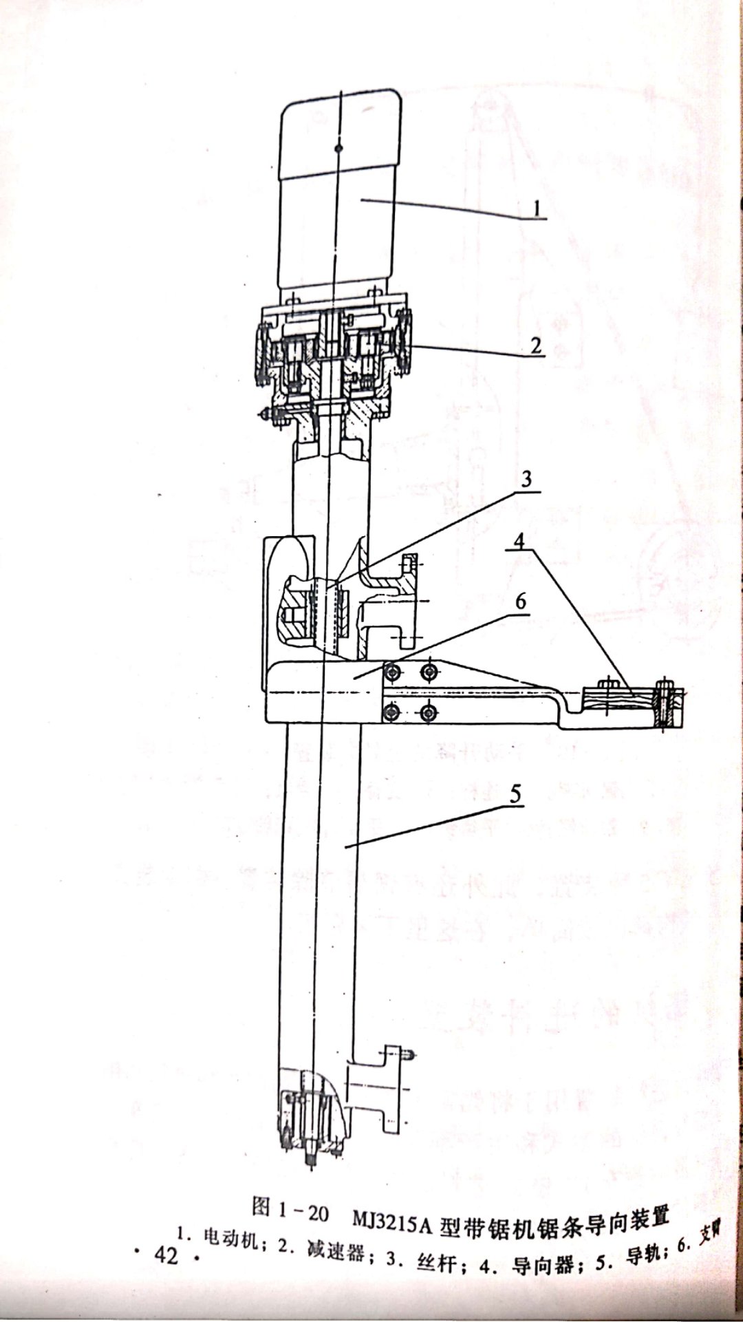 圖1-20為M3215A型跑車木工帶鋸機(jī)的鋸條導(dǎo)向裝置,是電動機(jī)驅(qū)動的鋸條導(dǎo)向裝置。電動機(jī)1經(jīng)減速器2(行星輪或齒輪減速器)帶動絲桿3旋轉(zhuǎn),帶動帶螺母的支臂(鋸卡臂)6沿