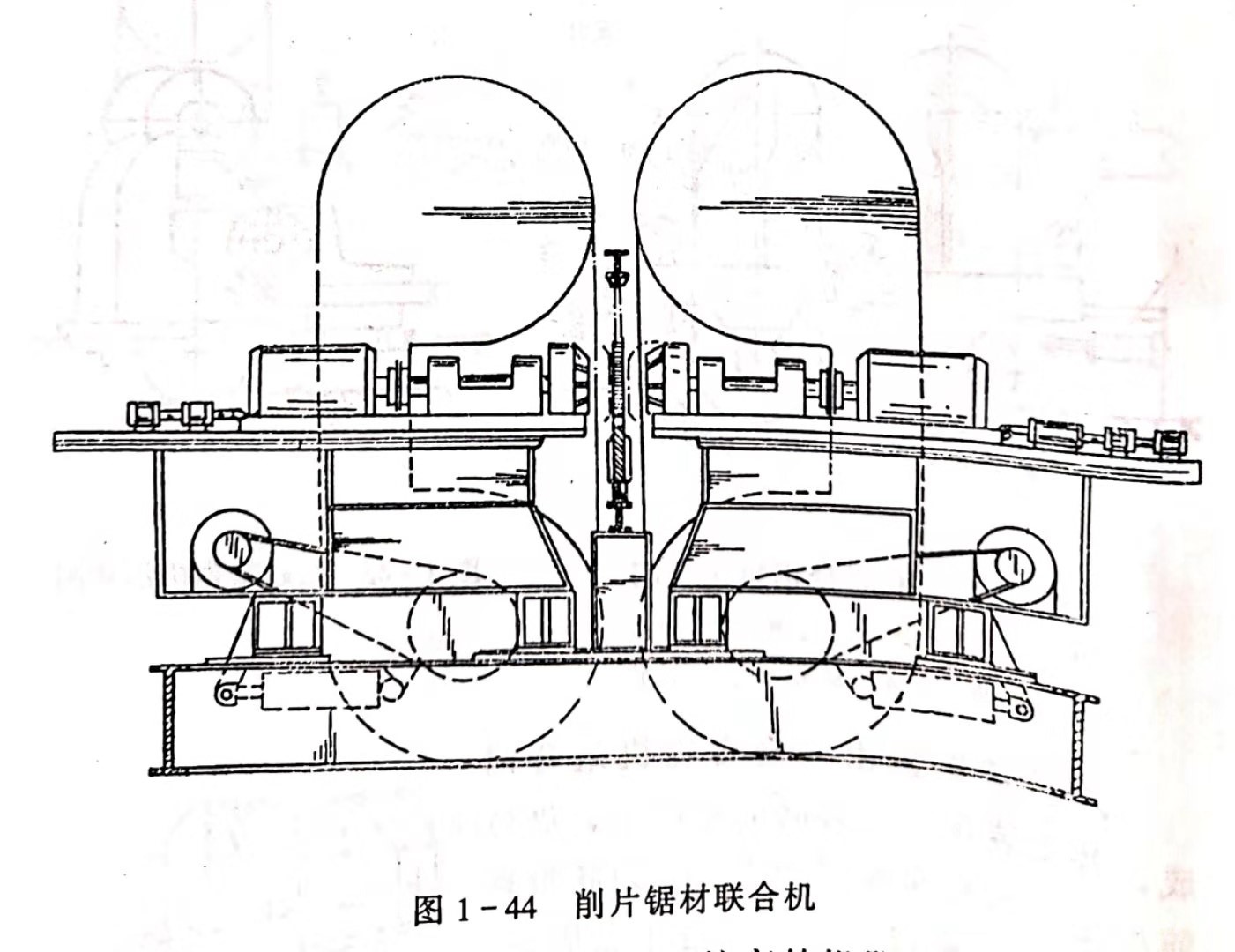 削片鋸材聯(lián)合機由2個削片頭和雙聯(lián)帶鋸機組成(圖1-44)。