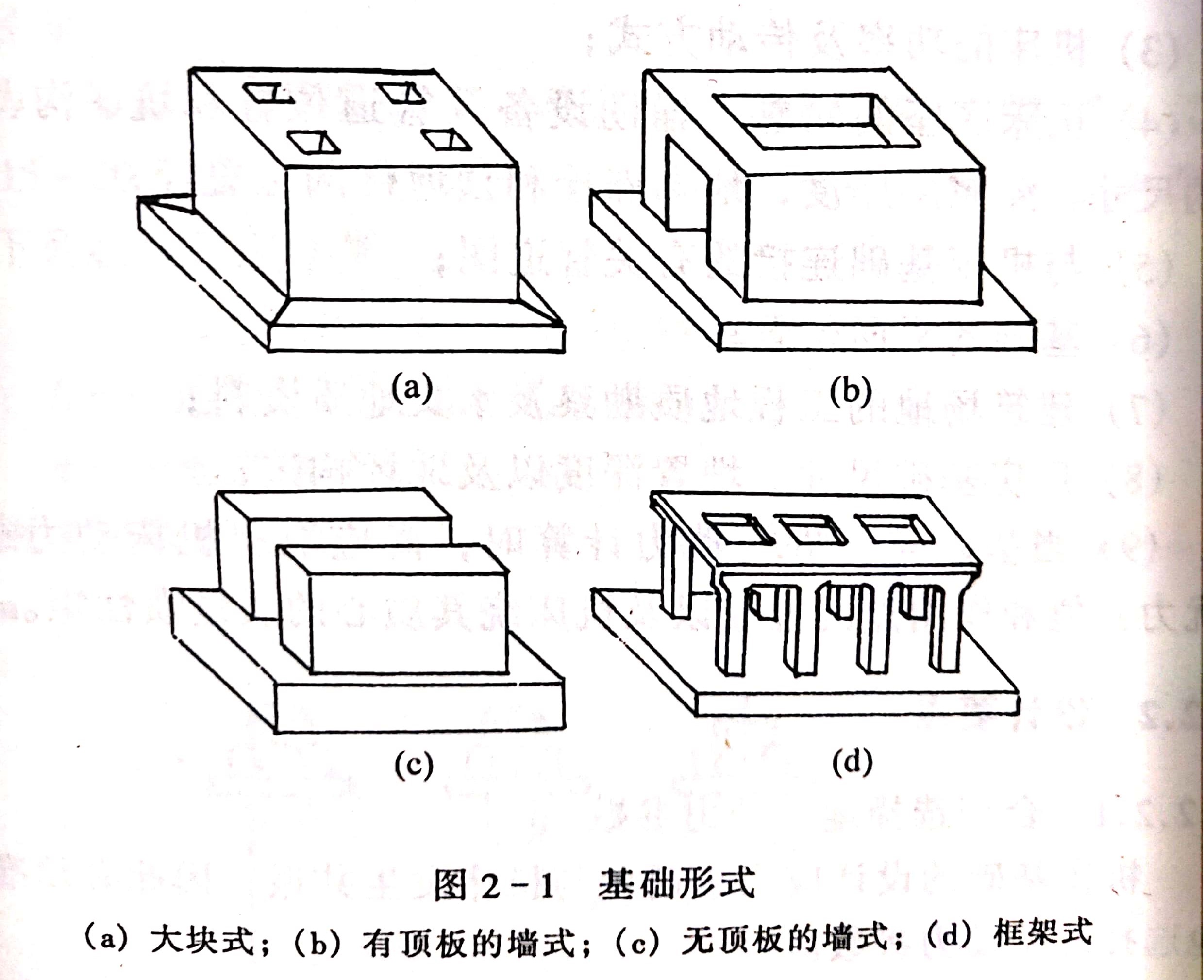 機器基礎(chǔ)的形式,主要有大塊式、墻式和框架式3種,如圖2-1所示。