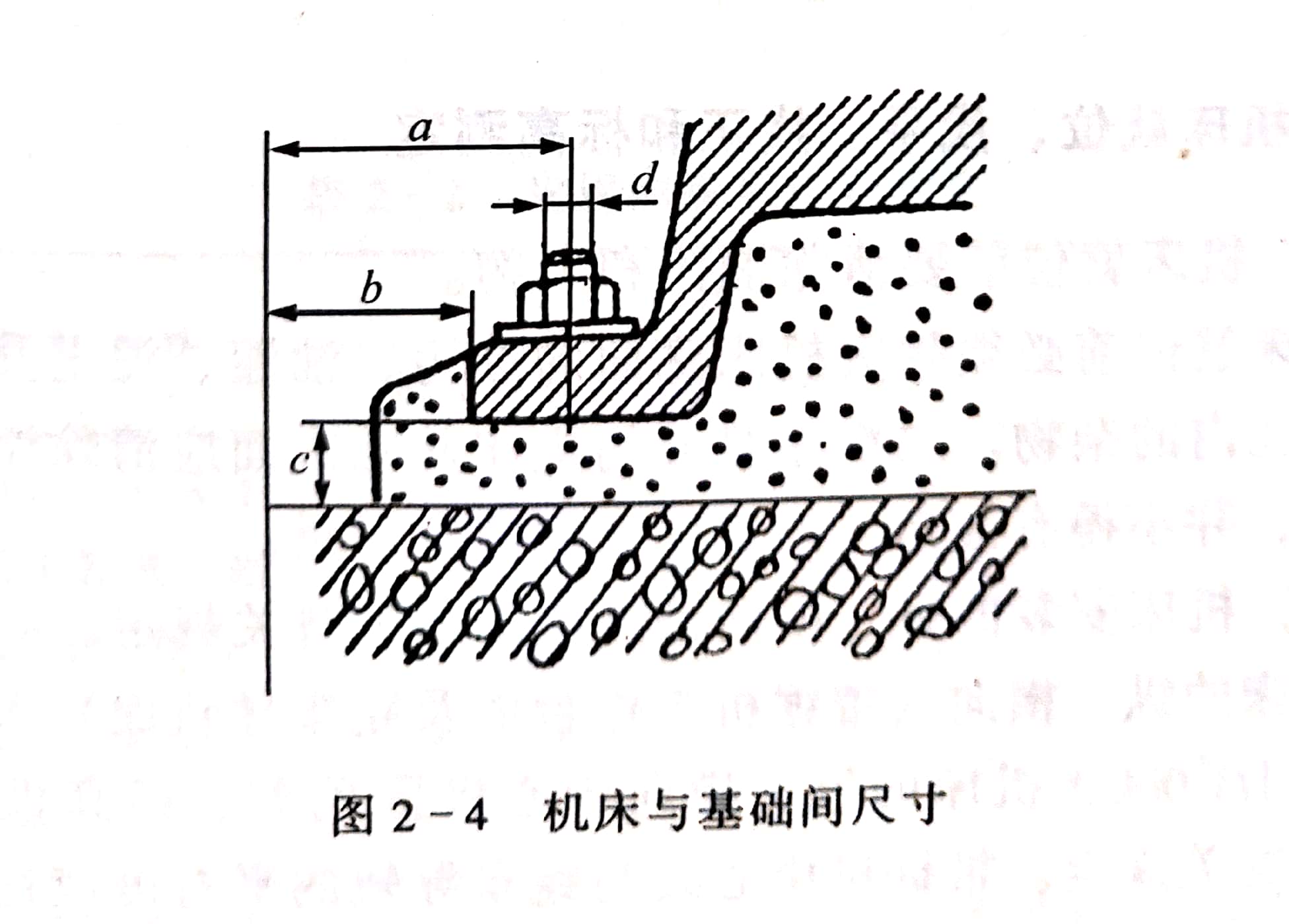 地腳螺栓距基礎外邊的距離a≥4d;機床底座周邊與基礎邊沿的距離b一般為50~120mm,如檢修走人,可適當加大;