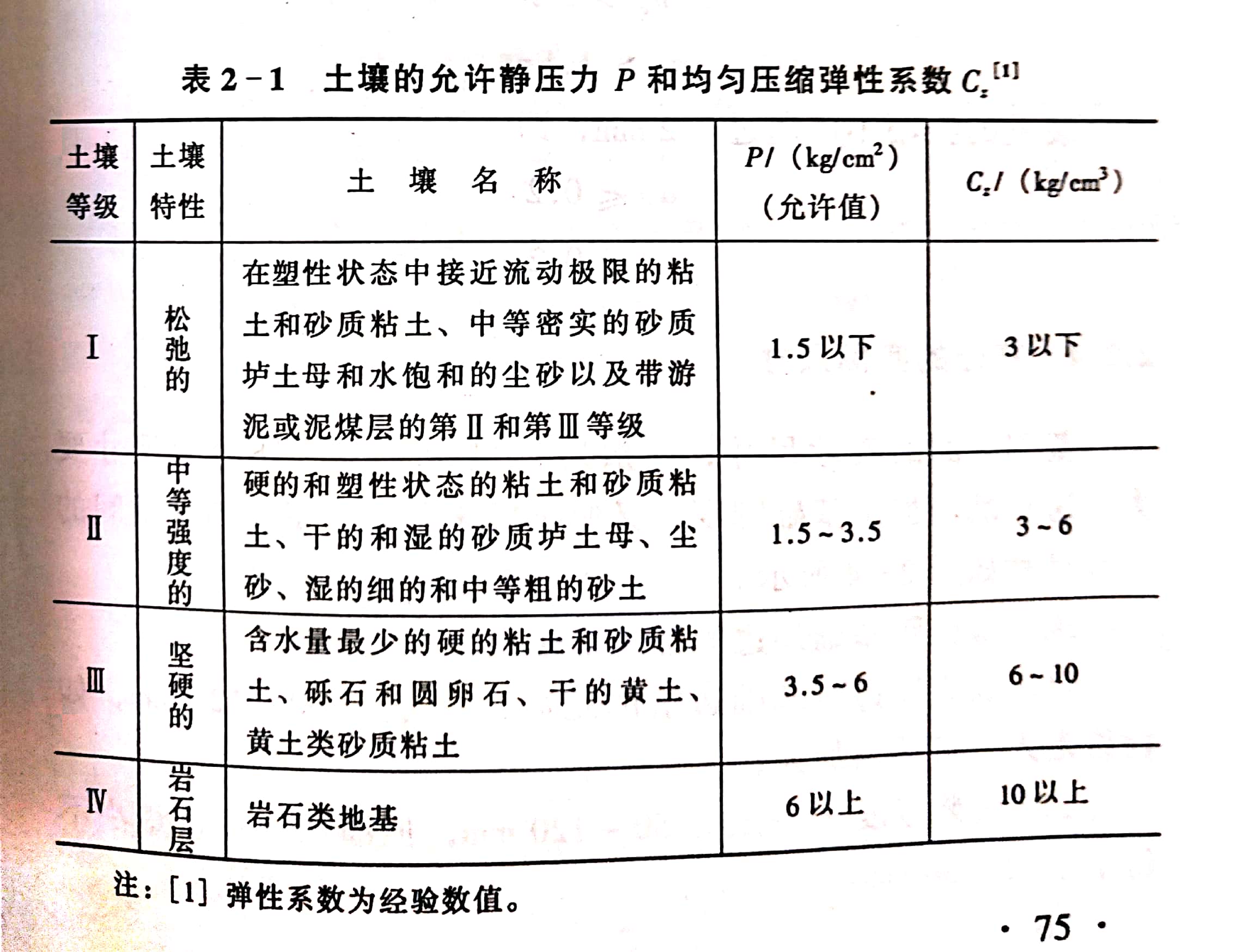 土壤的允許靜壓力可從表2-1查出,兩者對照即可知道初步確定的基礎面積能否滿足要求。