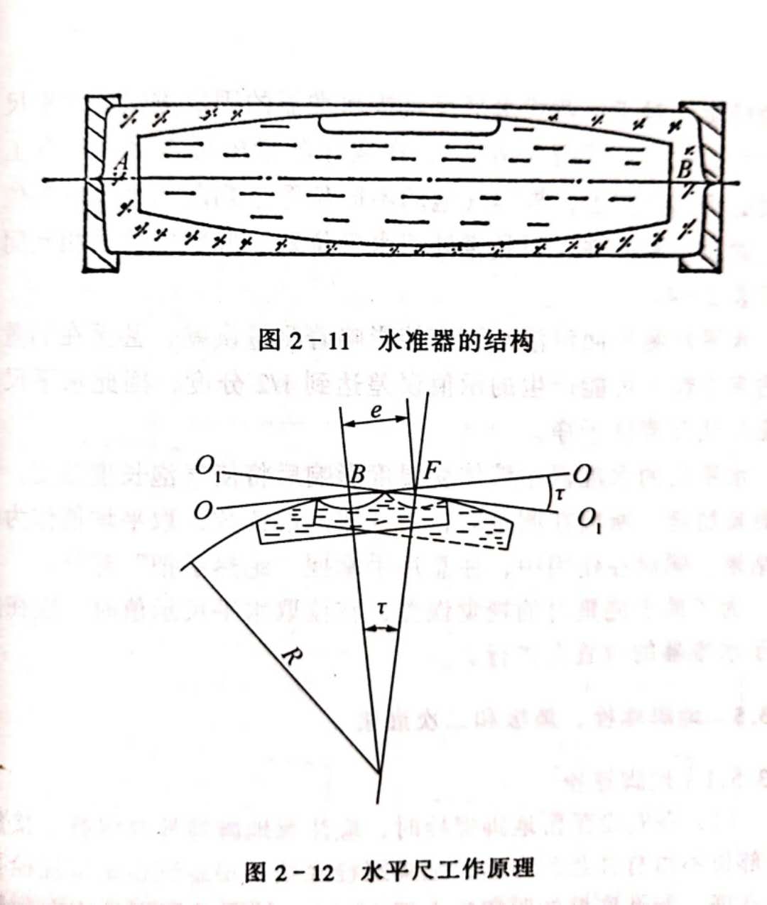 水平尺是以水準(zhǔn)器作為測(cè)量和讀數(shù)元件的一種量具。水準(zhǔn)器是一個(gè)密封的玻璃管,內(nèi)表面的縱斷面為具有一定曲率半徑的圓弧面,如圖2-11所示。管內(nèi)裝有不凍結(jié)的、粘滯系數(shù)較小的液體(如酒精、乙醚及其混合液體),沒(méi)有液體的部分叫做水準(zhǔn)氣泡,由酒精或乙醚充入氣泡內(nèi)。當(dāng)水準(zhǔn)器在水平位置時(shí),氣泡占有管內(nèi)的最高位置(圖2-12中的B處)。如果水準(zhǔn)器的一端傾斜τ角,則氣泡力求占有最高位置而移到位置較高的那一端,如圖2-12中的F處(虛線所示)。氣泡與水準(zhǔn)器中間位置(B處)的偏移量為e,也就是水準(zhǔn)器刻線間距。傾斜角x、刻線間距e與曲率半徑R間有如下關(guān)系