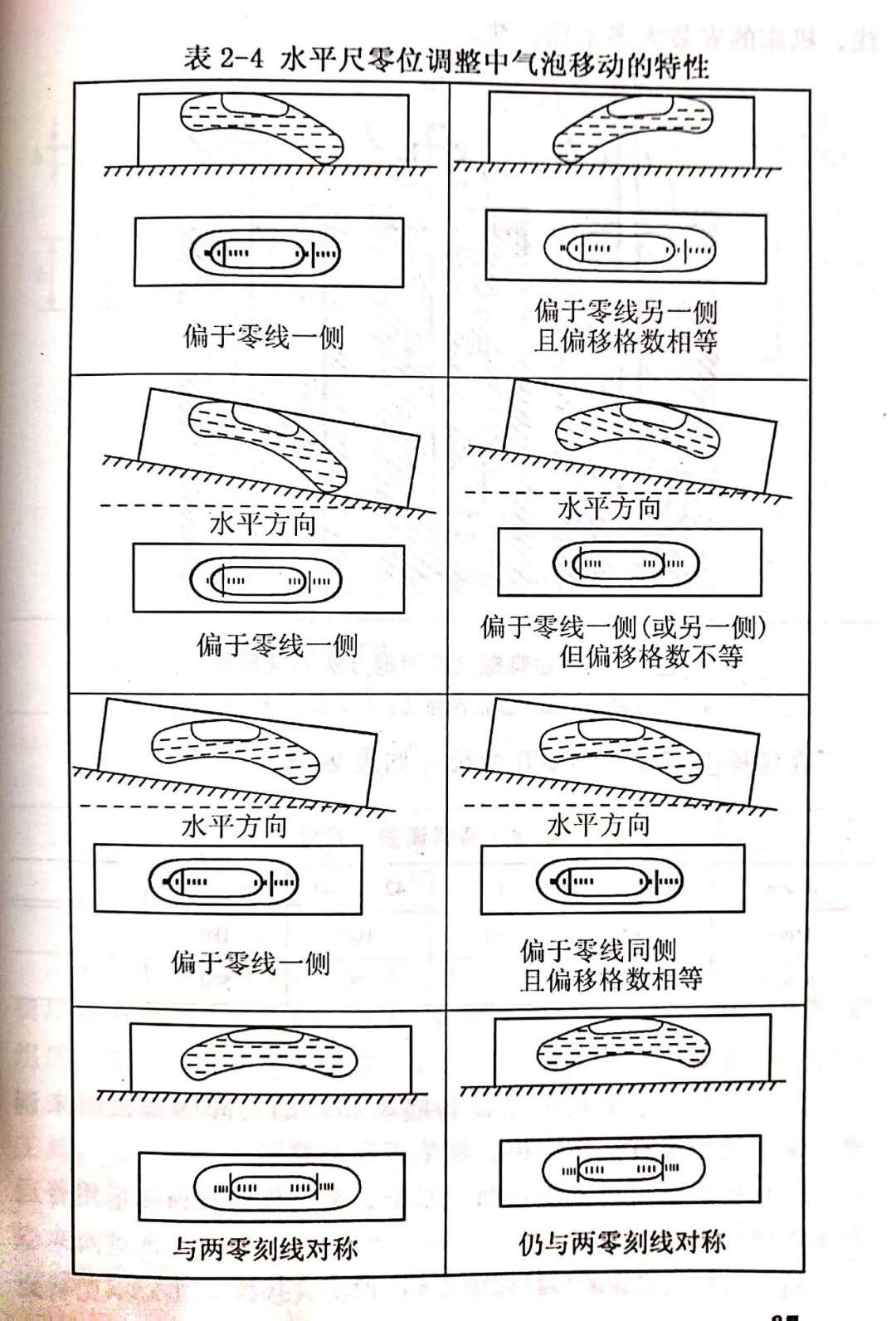 在應(yīng)用水平尺進(jìn)行測(cè)量前,應(yīng)檢查其零位是否正確,如果零位不正確應(yīng)該進(jìn)行調(diào)整,以保證測(cè)量的精度。對(duì)于可調(diào)式水平尺(按水準(zhǔn)器的固定方式,水平尺時(shí)分為可調(diào)式和不可調(diào)式兩種),在實(shí)際測(cè)量中可按水平尺在工件表面的不同方向上,根據(jù)氣泡的不同位置來(lái)判斷水平尺的零位是否正確及被測(cè)工件表面是否處于水平位置。鑒別方法及相互間關(guān)系見(jiàn)表2-4。