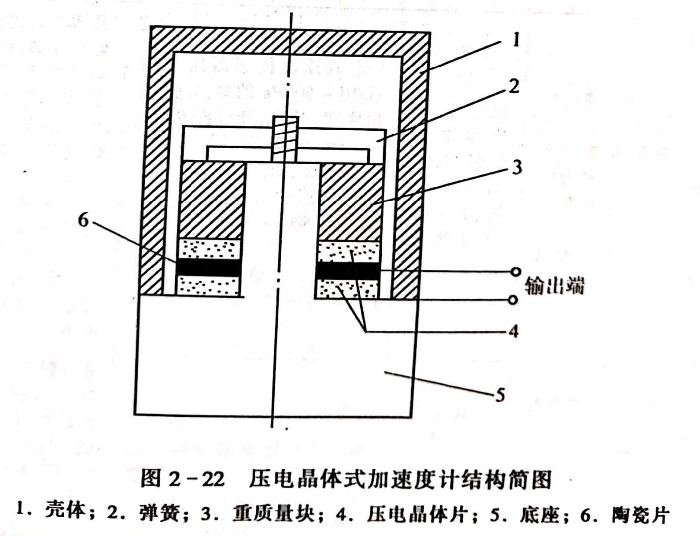 YD系列壓電晶體式加速度計(jì)結(jié)構(gòu)簡(jiǎn)圖見圖2-22。它的殼體由金屬外殼1和底座5構(gòu)成。在殼體內(nèi)有硬彈簧2將重質(zhì)量塊3壓緊。在重質(zhì)量塊3下面有兩片壓電晶體片4。輸出端引線分別從陶瓷片6及外殼引出。當(dāng)傳感器受到箭頭方向振動(dòng)時(shí),彈簧2和重質(zhì)量塊3構(gòu)成地震儀式加速度傳感器。重質(zhì)量塊與底座的相對(duì)位移正比于殼體的加速度。壓電晶體在重質(zhì)量塊交變壓力作用下,晶體片兩面產(chǎn)生與加速度成正比的交變電壓。