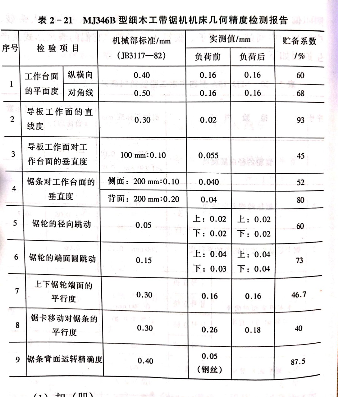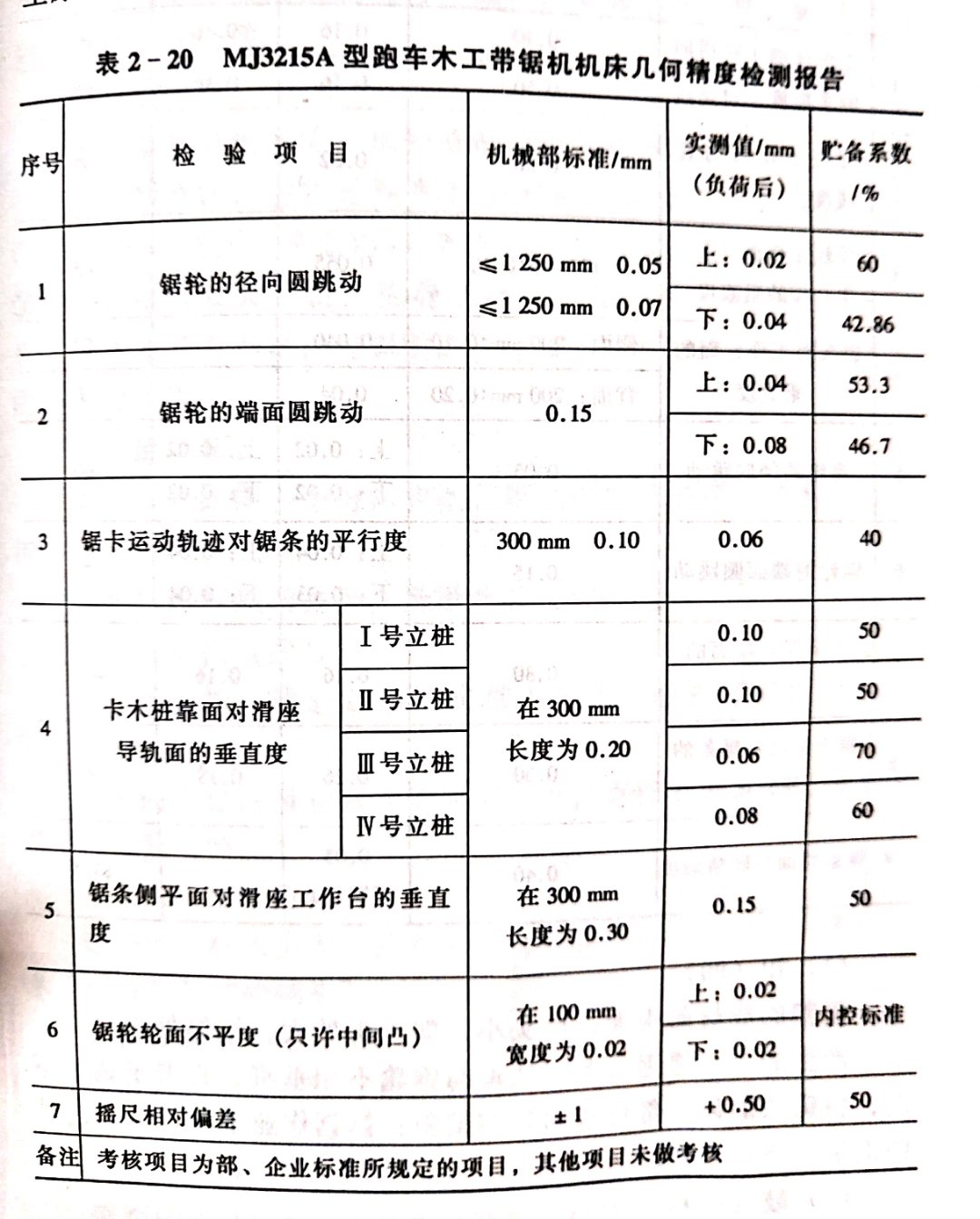 表2-20是《MJ3215A型跑車木工帶鋸機(jī)機(jī)床幾何精度檢測報(bào)告》;表2-21是《MJ346B型的細(xì)木帶鋸機(jī)機(jī)床幾何精度檢測報(bào)告》。檢測機(jī)床是瑞福祥木工機(jī)械廠生產(chǎn)的兩種帶鋸機(jī)。