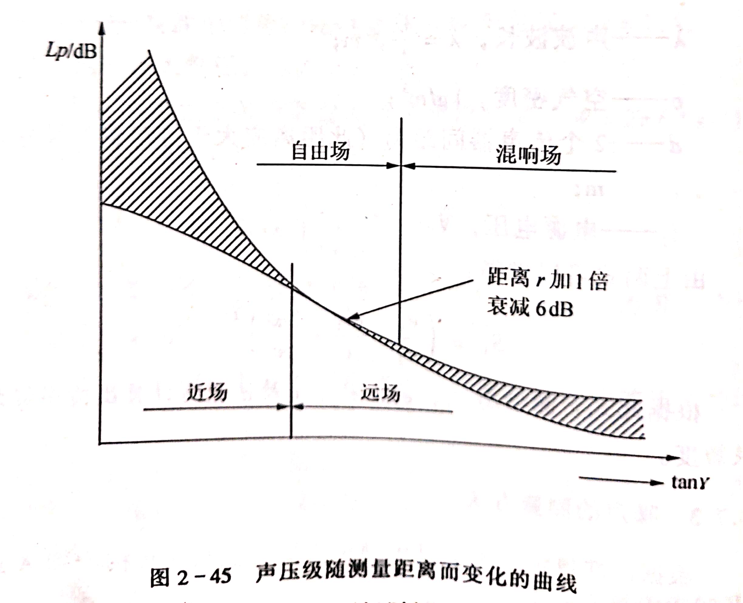 圖2-45陰影部分表示聲壓級隨測量距離的變化而波動。在自由場的近場,測點(diǎn)靠近聲源,噪聲波動大;在混響場中,測點(diǎn)的聲壓級隨測量距離的增加而波動,均呈不穩(wěn)定聲場。因此,應(yīng)盡可能將測點(diǎn)選擇在自由場聲場較為穩(wěn)定的遠(yuǎn)場區(qū)域內(nèi)。