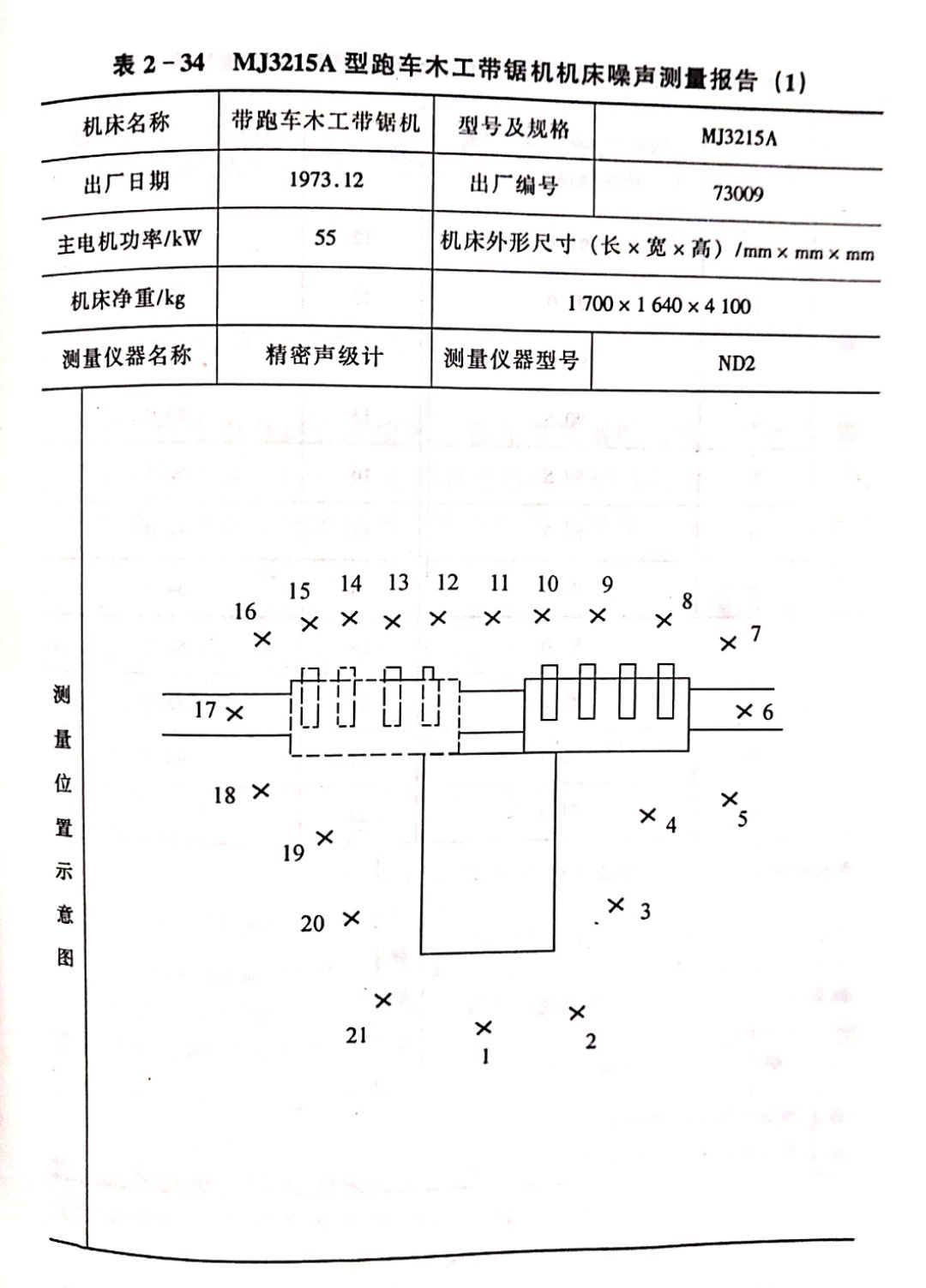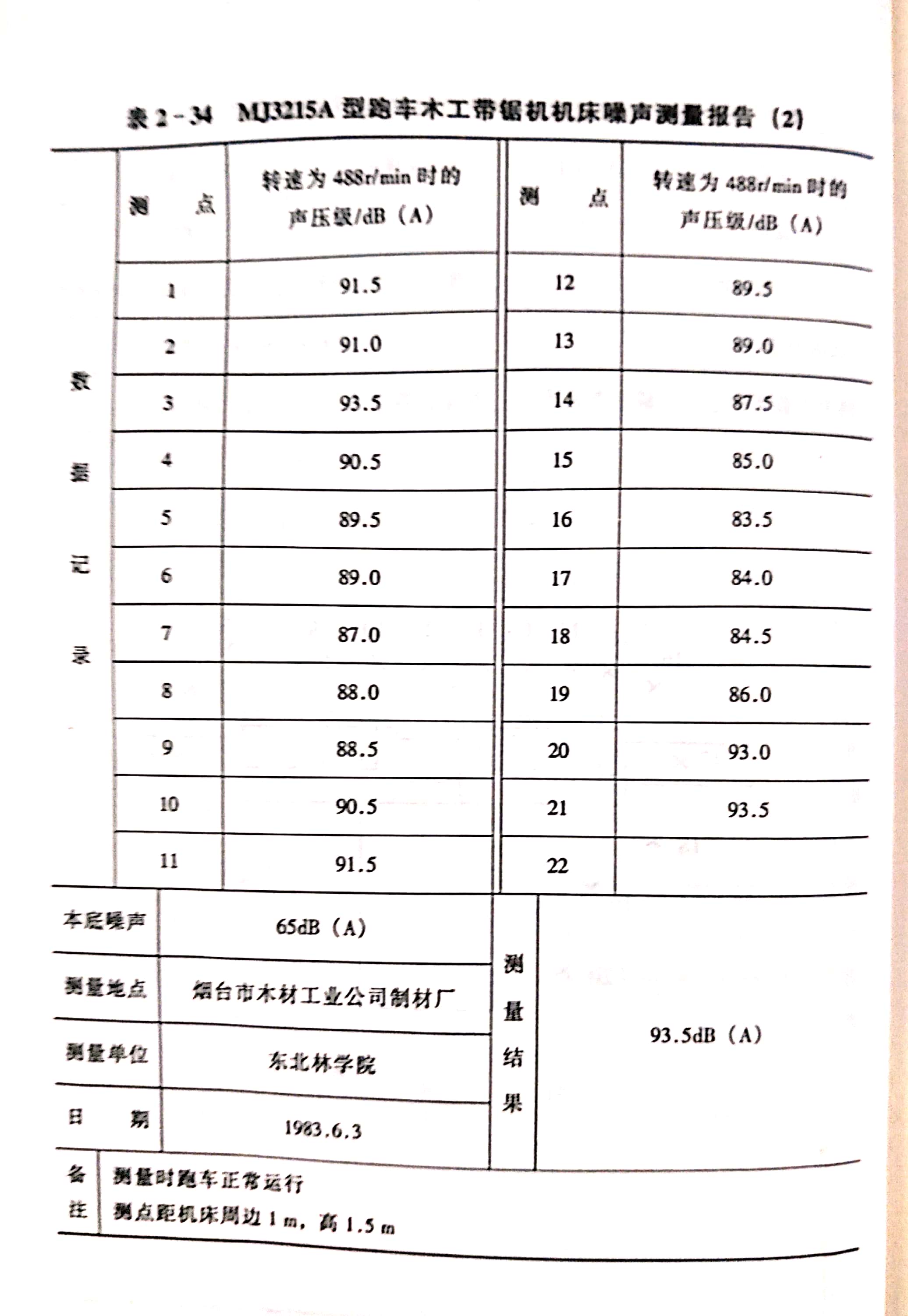 林業(yè)部木工機械產(chǎn)品質(zhì)量監(jiān)督檢驗站于1983年在煙臺木材工業(yè)公司制材廠現(xiàn)場測定的、瑞福祥木工機械廠生產(chǎn)的《M3215A型跑車木工帶鋸機的噪聲測量報告》如表2-34所示。