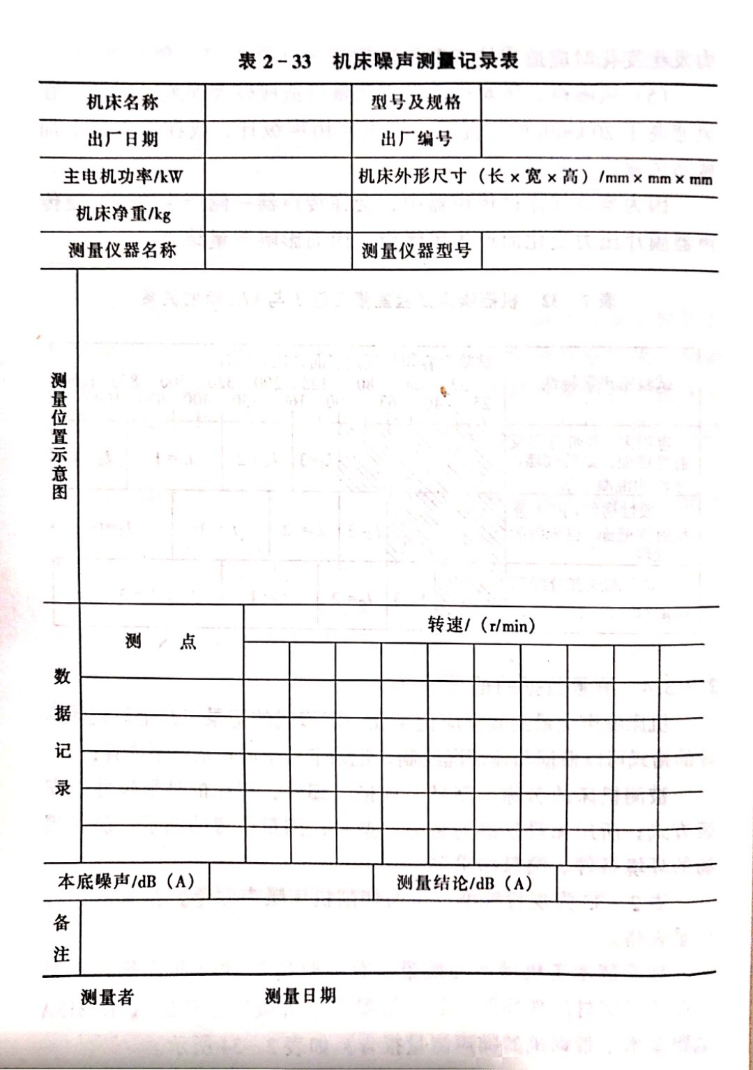表2-33為現(xiàn)行標準《金屬切削機床噪聲測量》推薦的一種記錄表格。