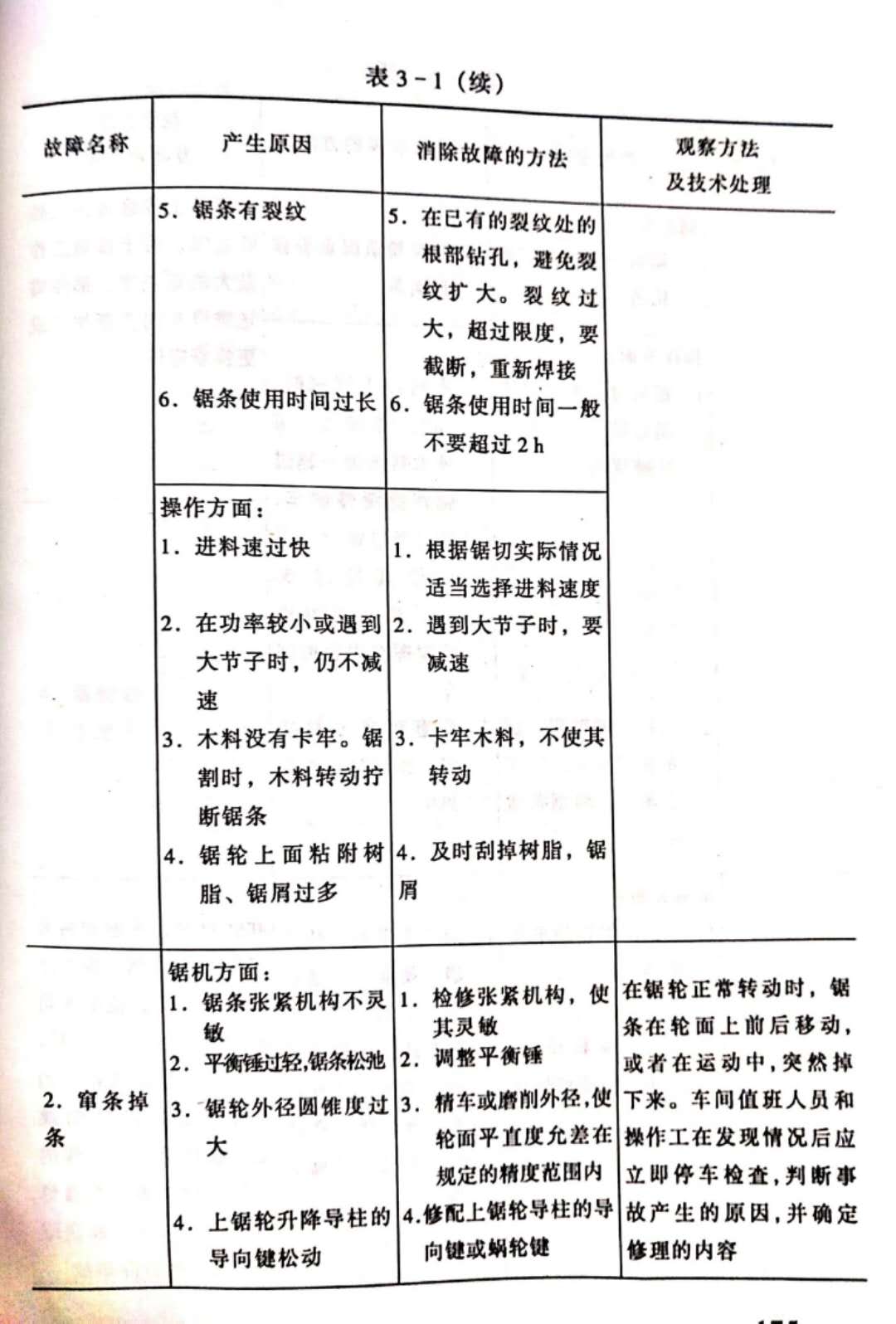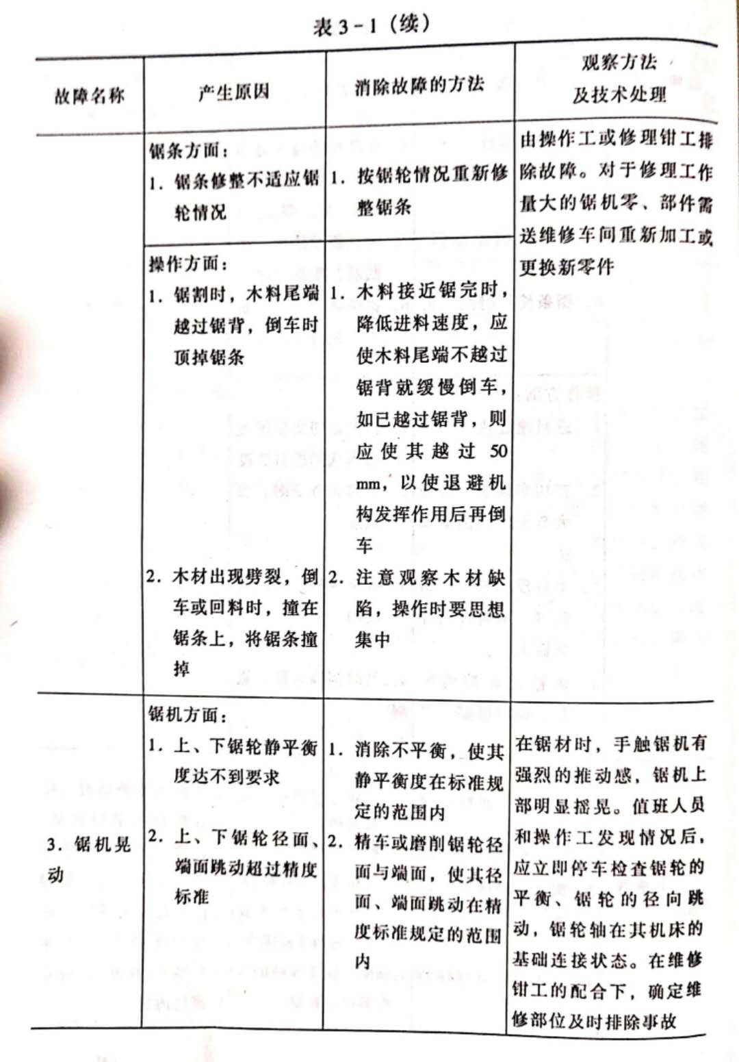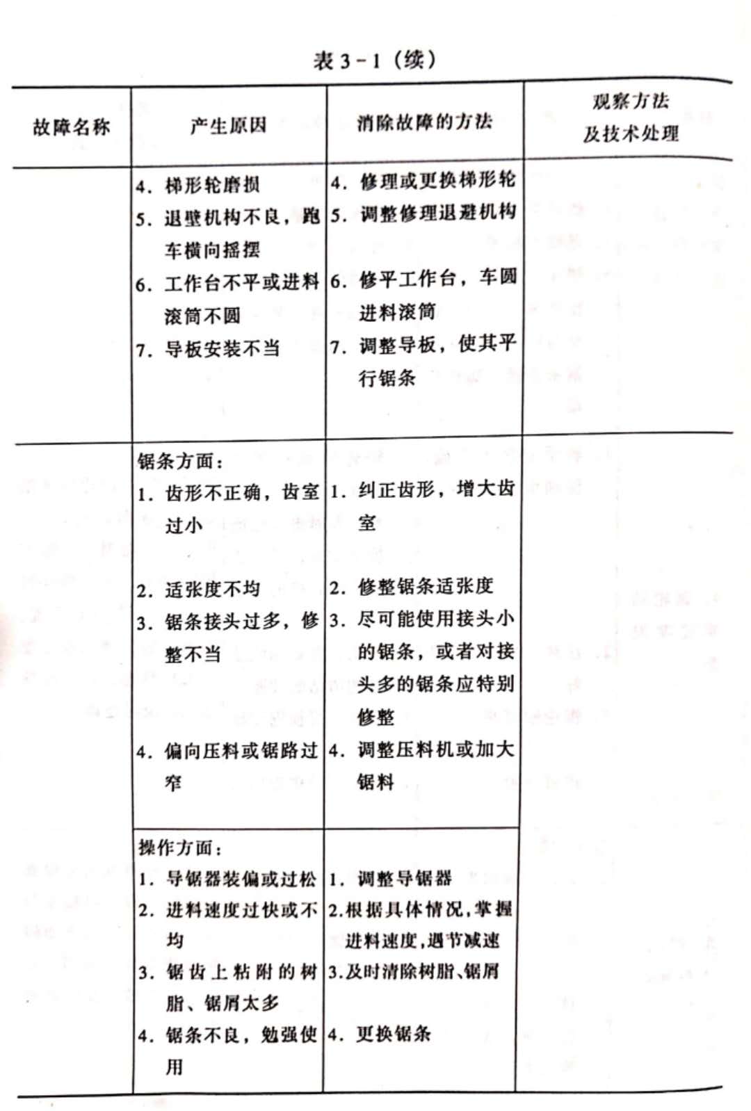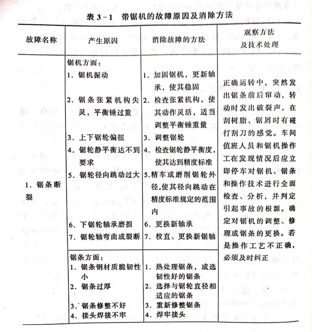 為了保證值班人員能履行技術(shù)監(jiān)督的職責(zé),必須制定值班人員技術(shù)監(jiān)督須知。在須知中,規(guī)定值班人員的義務(wù)和職權(quán),規(guī)定交接班時(shí)間和順序,規(guī)定設(shè)備小修的時(shí)間和順序。在須知中,還要列入鋸機(jī)安全技術(shù)細(xì)則和勞動(dòng)保護(hù)細(xì)則。帶鋸機(jī)的故障產(chǎn)生原因及其消除方法列入表3-1。