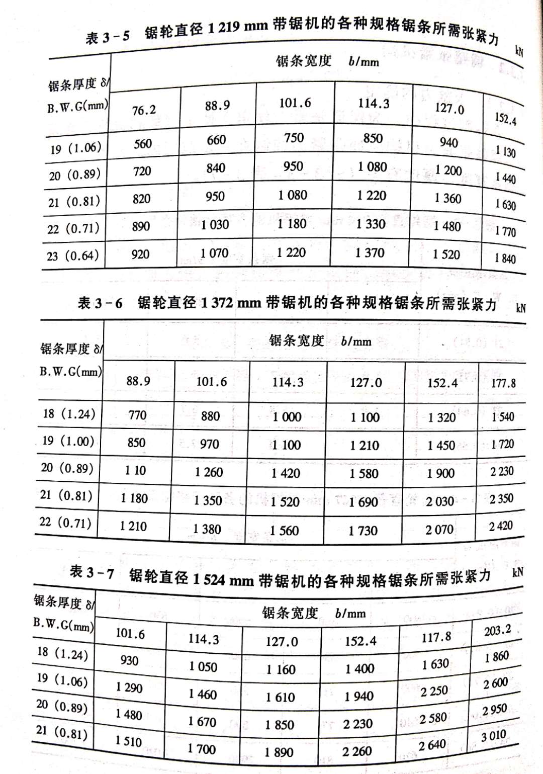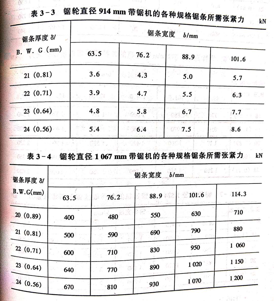 [導(dǎo)讀]:張緊力的確定 在鋸割過程中,為保證張緊力穩(wěn)定,使鋸割順利進行,掛條 后,調(diào)整張緊力機構(gòu)應(yīng)使張緊力控制在一定范圍內(nèi)。張緊力大小 與鋸條寬度、厚度有關(guān)(表3-3~表3-7)。 張緊力的大小除