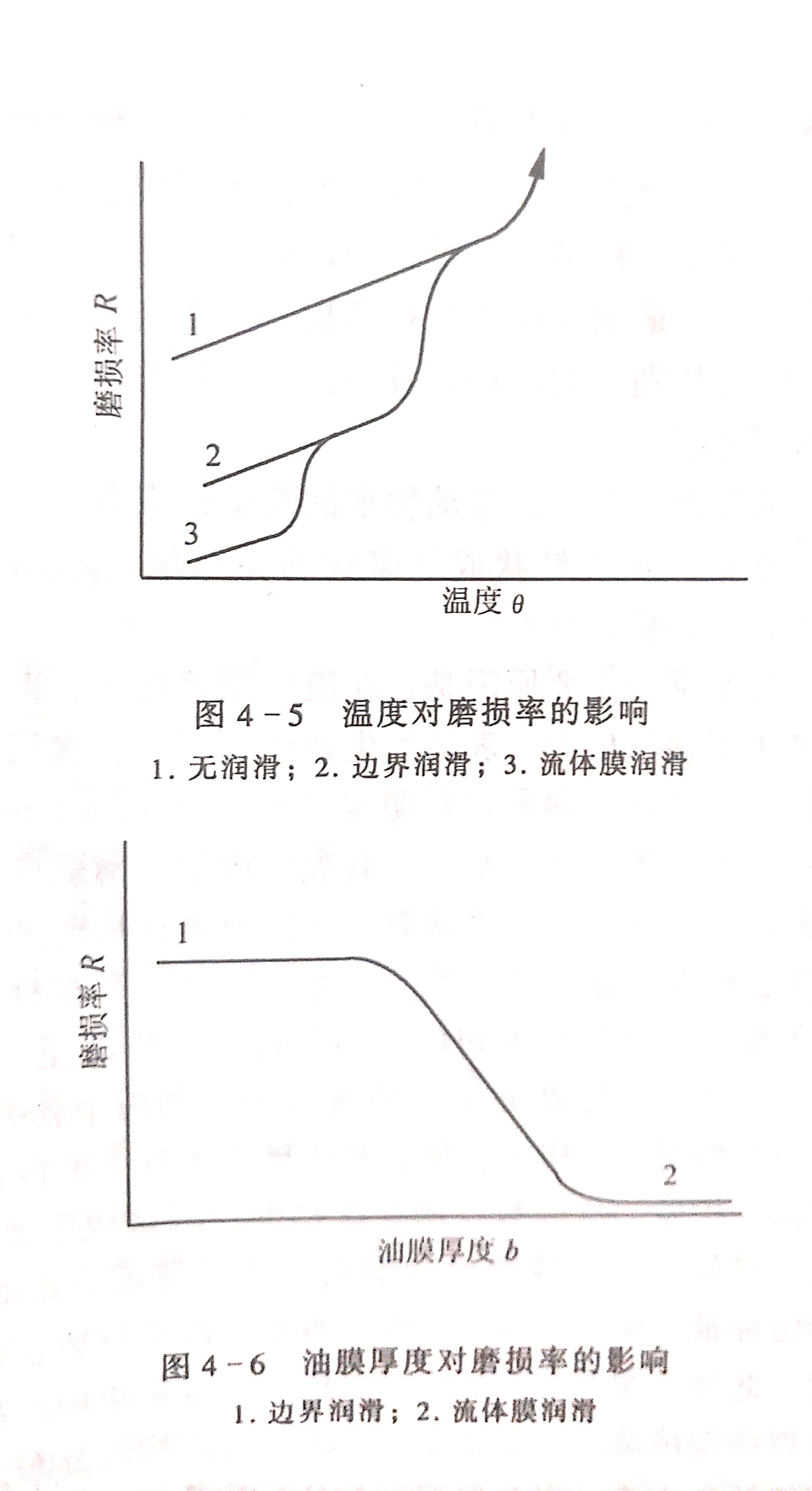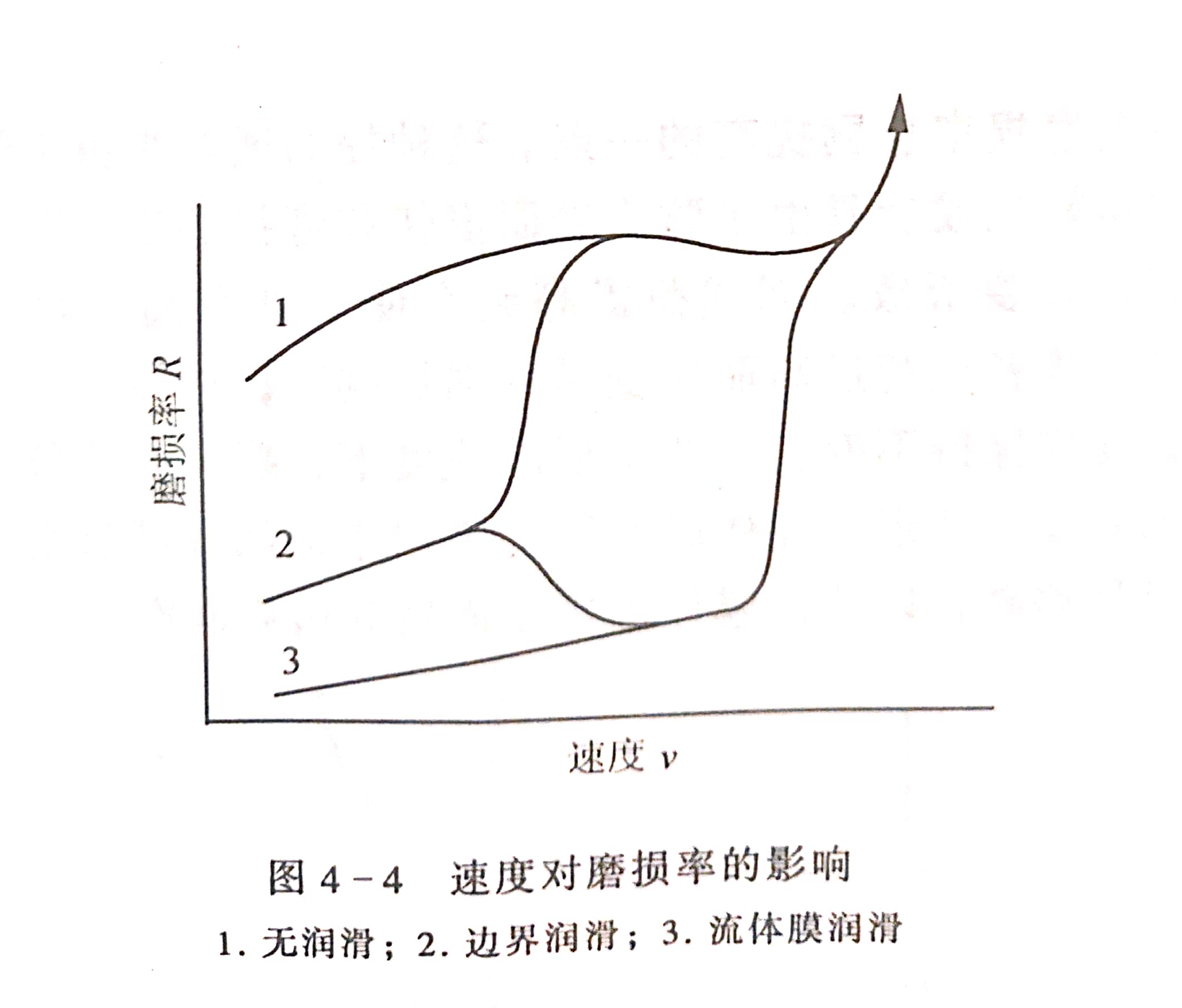 如圖4-4所示。提高無潤滑接觸處的速度,通常會(huì)使磨損率提高到使材料發(fā)生明顯的熱軟化(與載荷的作用相同)。然而,在較高的速度下,磨損率可能降低,因?yàn)楫a(chǎn)生一個(gè)完整磨粒的時(shí)間較少。邊界潤滑的磨損率常常隨速度的提高而提高,直到潤滑劑因溫升而失效為止。如果潤滑劑含有合適的添加劑,就不會(huì)出現(xiàn)失效速度,反而磨損率將隨著流體膜厚度增大到完全流體膜的厚度而降低。流體膜的磨損率非常低(接近于零),除非達(dá)到的溫度使?jié)櫥瑒┎辉侔褍杀砻嫱耆糸_(因溫升而失效)或較高的速度下循環(huán)次數(shù)增多使磨損類型轉(zhuǎn)為疲勞磨損。