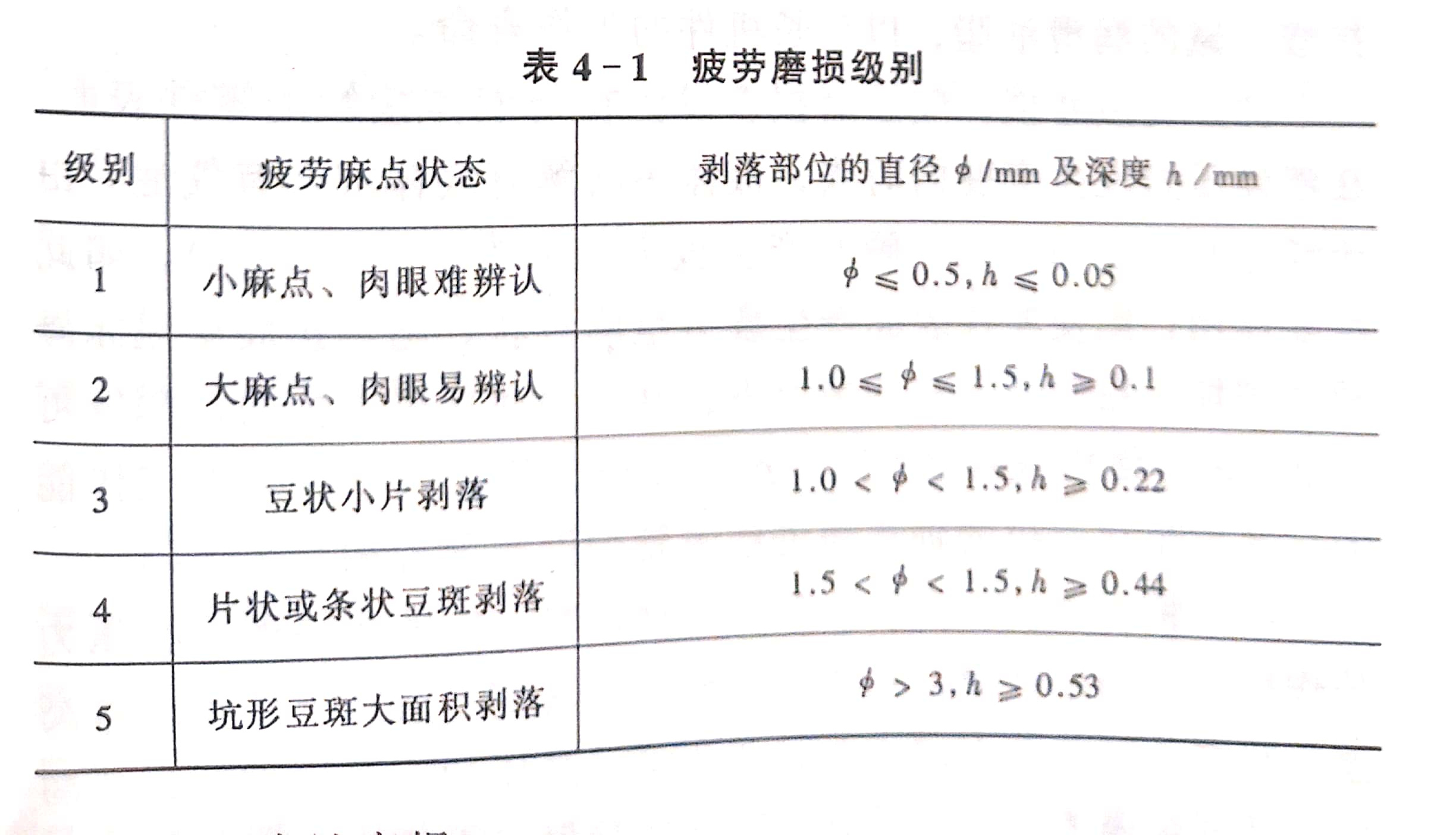 疲勞磨損的程度,可以分為5個級別,見表4-1。