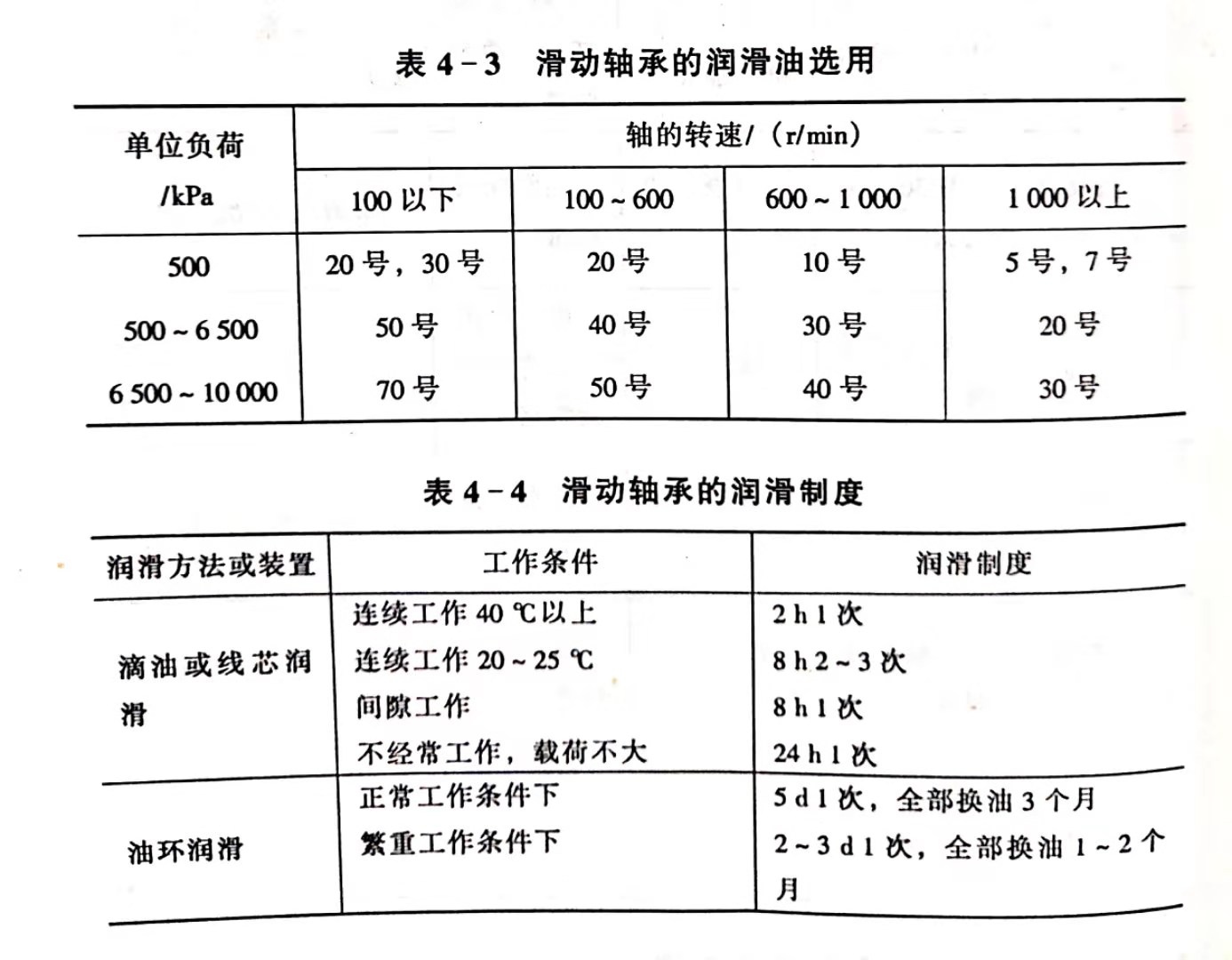 ④負(fù)荷愈大潤(rùn)滑油的粘度也應(yīng)愈大。負(fù)荷愈小潤(rùn)滑油的粘度也應(yīng)愈小。滑動(dòng)軸承的潤(rùn)滑油選用及其潤(rùn)滑制度見(jiàn)表4-3、表4-4.