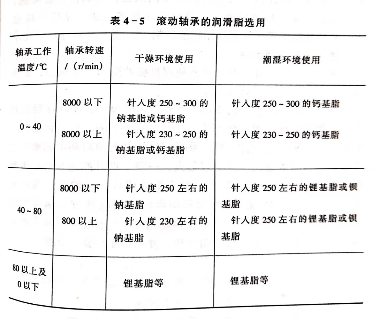 ②鋸機(jī)大多數(shù)滾動(dòng)軸承都采用潤(rùn)滑脂潤(rùn)滑,選用時(shí)應(yīng)考慮轉(zhuǎn)速、負(fù)荷、工作溫度及工作環(huán)境等。工作溫度不高于70℃,在潮濕環(huán)境中工作的軸承可選用耐水性較好的鈣基脂;一般溫度(30~90℃)下工作的滾動(dòng)軸承。低速采用鈉基或鈣鈉基脂;中速采用鈣基脂,但工作溫度不得超過(guò)70℃;高速采用鋰基脂或主軸脂;在極低溫(-50~70℃)下工作的滾動(dòng)軸承采用特殊雙脂。各種滾動(dòng)軸承潤(rùn)滑脂的選用可參考表4-5。