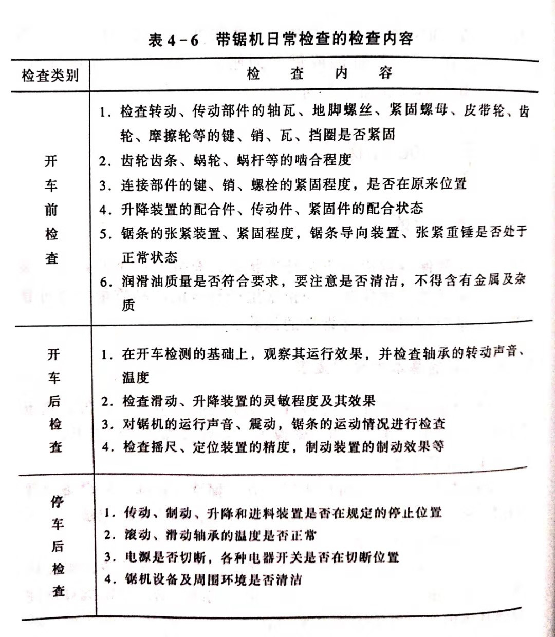 (2)帶鋸機(jī)的檢查。對設(shè)備做經(jīng)常性檢查,查清設(shè)備零件部件的狀態(tài),并作記錄,以便達(dá)到重點(diǎn)的維護(hù)保養(yǎng);準(zhǔn)備需要更換的零件、部件,做到有計劃的檢修。帶鋸機(jī)日常檢查的檢查內(nèi)容列入表4-6。