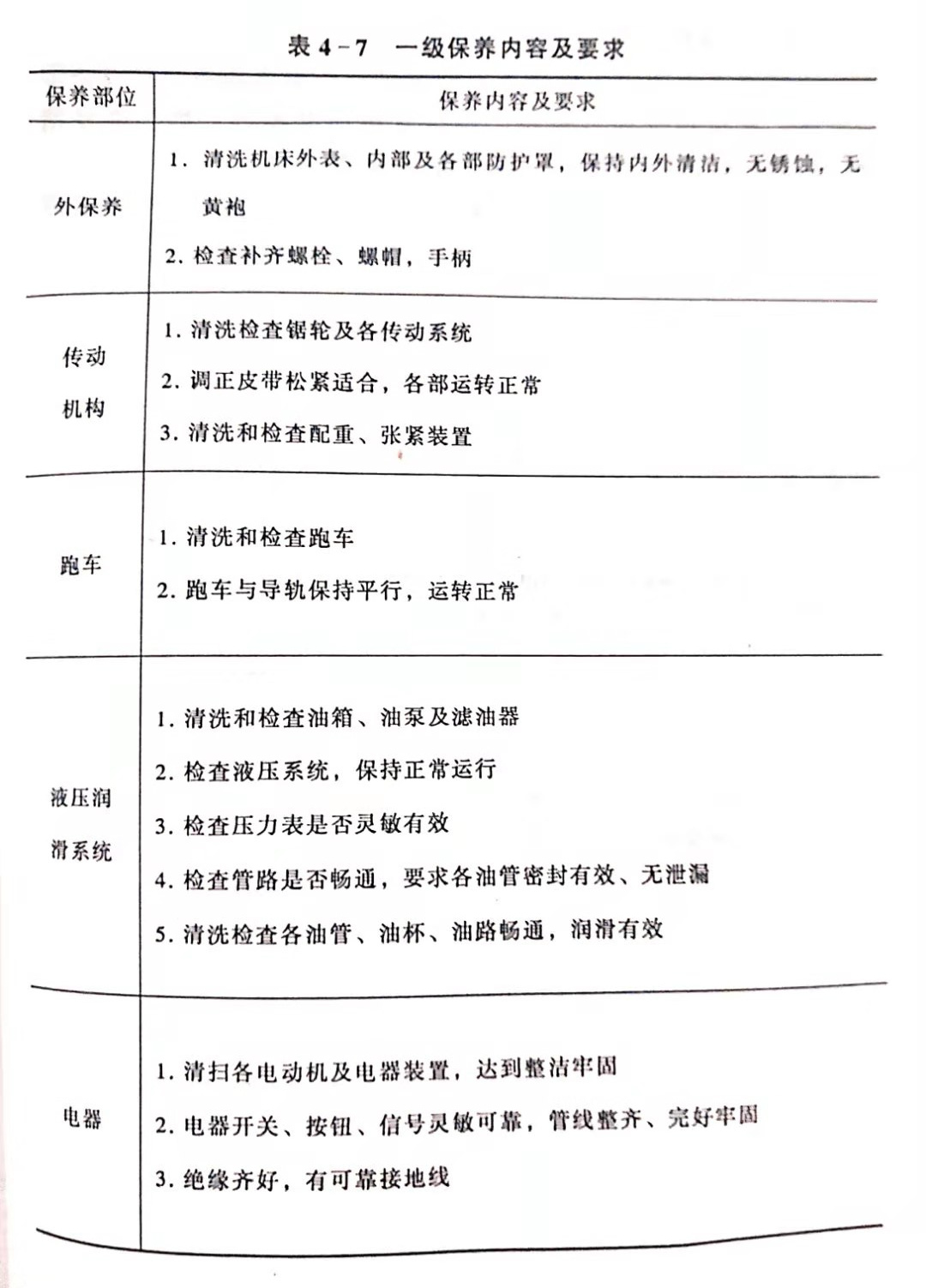 以操作工人為主,維修工人配合進(jìn)行。主要任務(wù)是部分解體檢査,疏通油路,清洗磨損面,更換油線、油氈,調(diào)整設(shè)備的各部配合間隙,緊固松動部位等。設(shè)備一般運(yùn)轉(zhuǎn)500h左右要進(jìn)行1次一級保養(yǎng)。一級保養(yǎng)的內(nèi)容及要求參見表4-7。