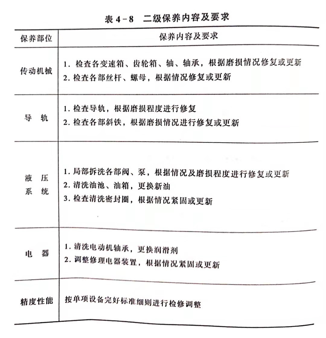 以維修工人為主,操作工人配合進(jìn)行。主要任務(wù)是對設(shè)備部分解體,重點(diǎn)精度項目檢查,修復(fù)或更換磨損件、局部恢復(fù)精度,潤滑系統(tǒng)清洗、換油,電氣系統(tǒng)檢查修理。設(shè)備累計運(yùn)轉(zhuǎn)1500~2000h要進(jìn)行1次二級保養(yǎng)。二級保養(yǎng)的基本內(nèi)容及要求參見表4-8。