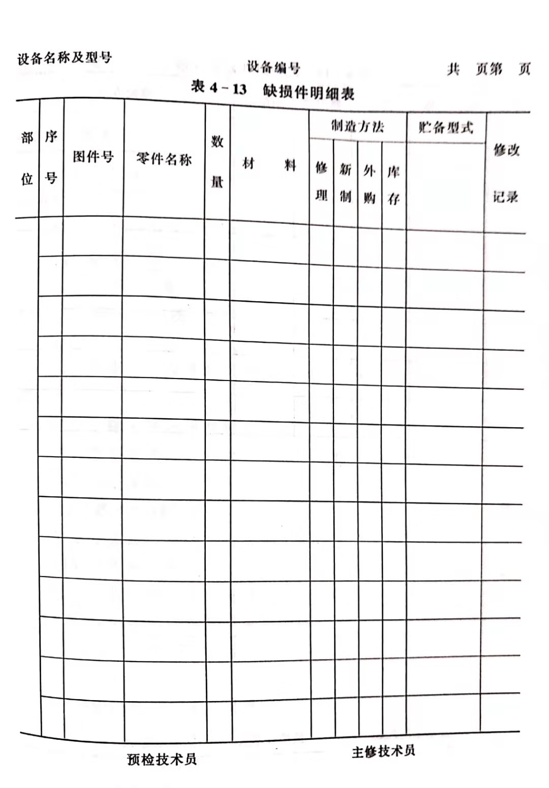 技術(shù)準(zhǔn)備書的編制工作由設(shè)備動力科的預(yù)修(或主修)工程技術(shù)人員負(fù)責(zé)編制。編制的依據(jù)是:使用車間送交的設(shè)備修理申請書;設(shè)備修前情況記錄表;設(shè)備歷次大、中修理,事故損壞及設(shè)備改裝情況等記錄。