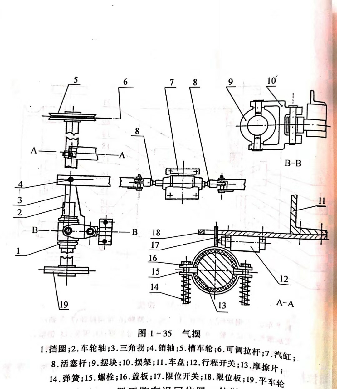 (4)氣擺。這種車擺的基本原理是通過氣缸、活塞推動(dòng)拉桿帶動(dòng)車架橫向移動(dòng)。圖1-35氣擺為信陽木工機(jī)械廠生產(chǎn)的MJ3212型跑車木工帶鋸機(jī)上所采用的車擺的結(jié)構(gòu)圖。