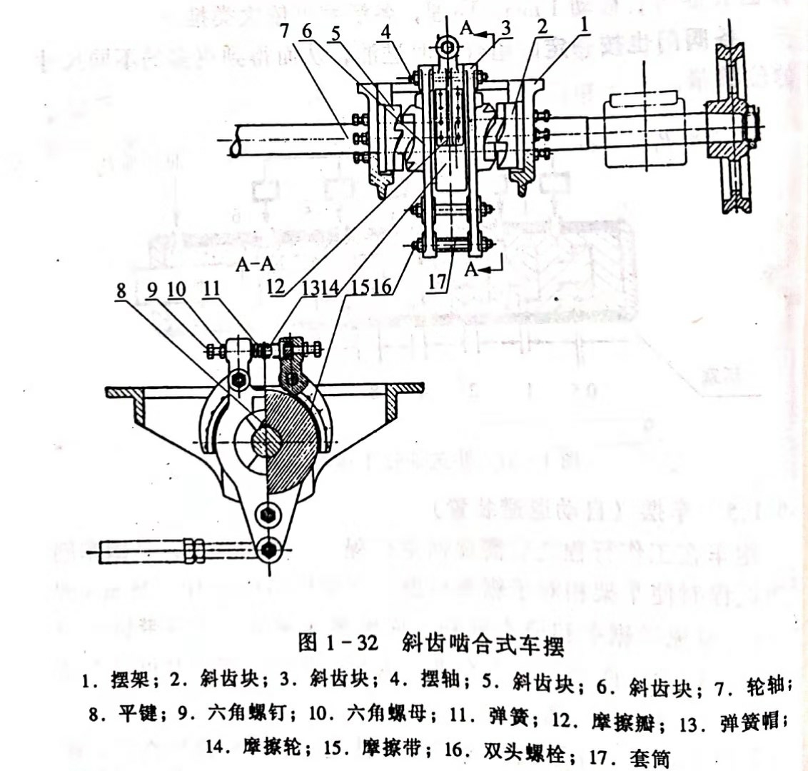 (1)斜齒嚙合式車擺。這種車擺又稱暗擺,是由斜面推力實(shí)現(xiàn)車架擺動(dòng)的。圖1-32為斜齒嚙合式車擺的結(jié)構(gòu)圖。