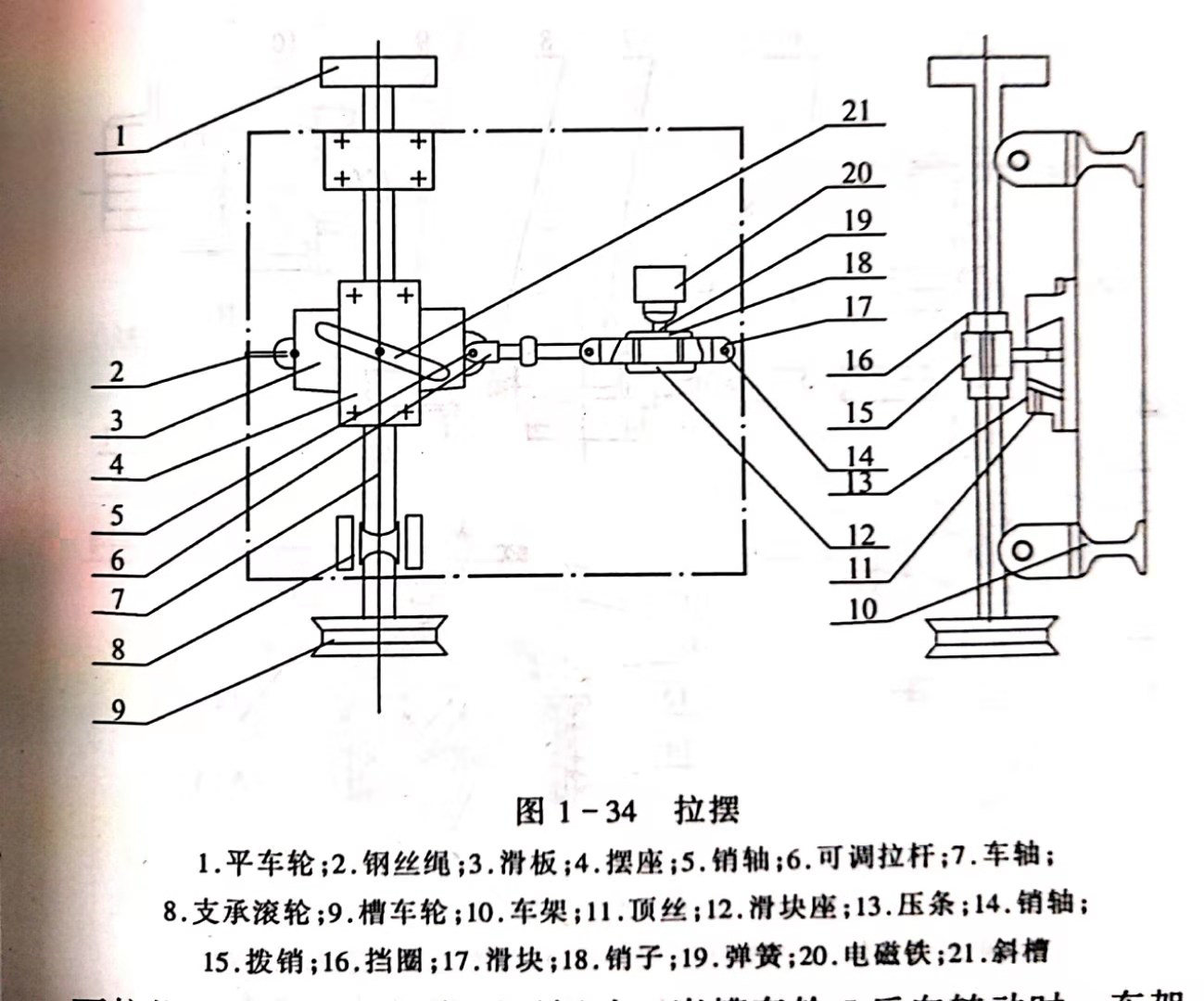 (3)拉擺。拉擺是以鋼絲繩拉動(dòng)滑板使車架橫向移動(dòng)的裝置,如圖1-34所示。